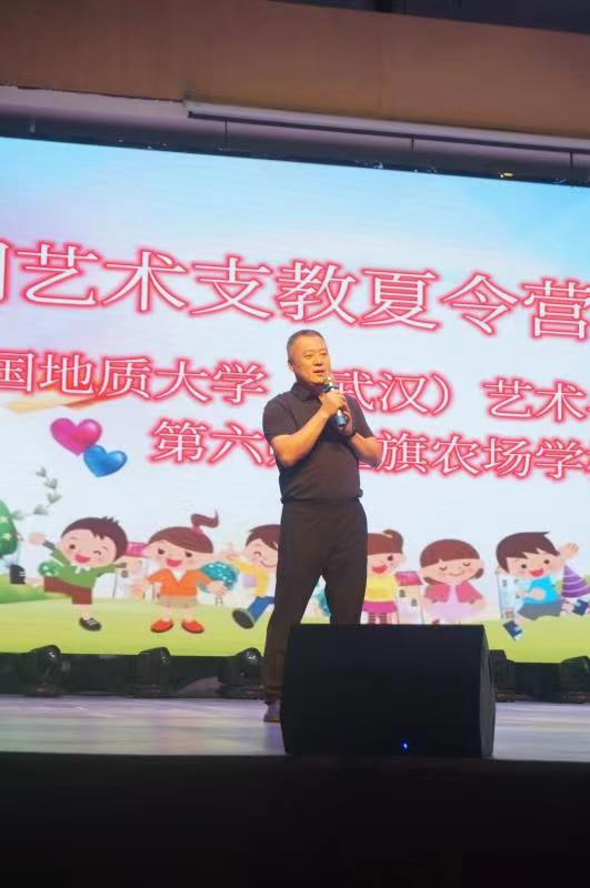 结营仪式伊始,中国地质大学(武汉)亚洲第一黄色网站党委副书记边建华上台致辞,边书记首先代表九里阳光艺术支教团对红旗农场的领导、红旗农场学校的领导和老师们对此次支教活动的信任和大力支持表达了最衷心的感谢。他表示自己在这里深深地感受到了红旗农场的小朋友们对艺术的热爱与天赋,相信此次支教活动将作为彼此合作的起点,丰富当地美育实践育人成果,贯彻落实新时代党的治疆方略,切实发挥高校“文化润疆”作用。最后,边书记预祝此次汇报演出取得圆满成功。