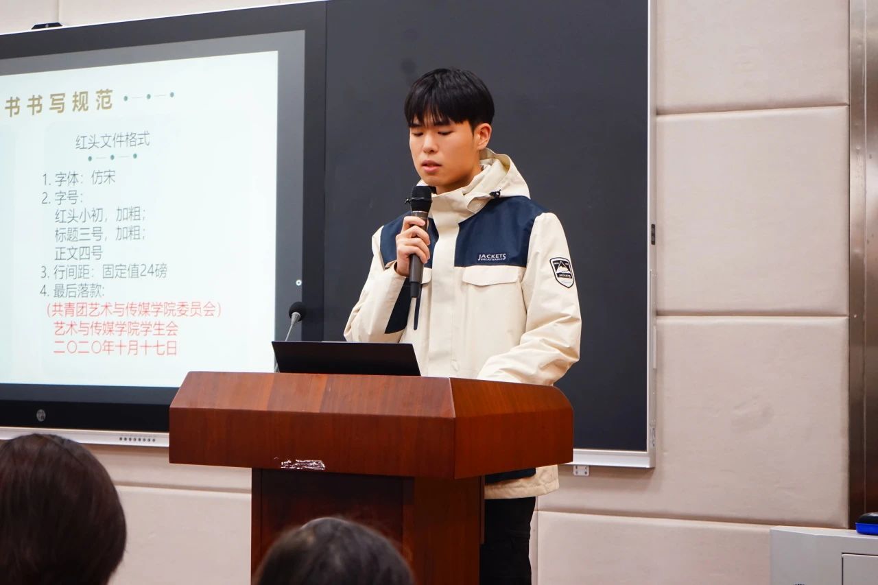 第二部分,学生会主席团成员余骥飞对学生会工作进行规范培训,分别从日常文书、活动策划、场地申请、财务报账四个层面对学生工作日常注意点进行着重讲解,为未来学生工作有序进行、效率提升打下坚实基础。