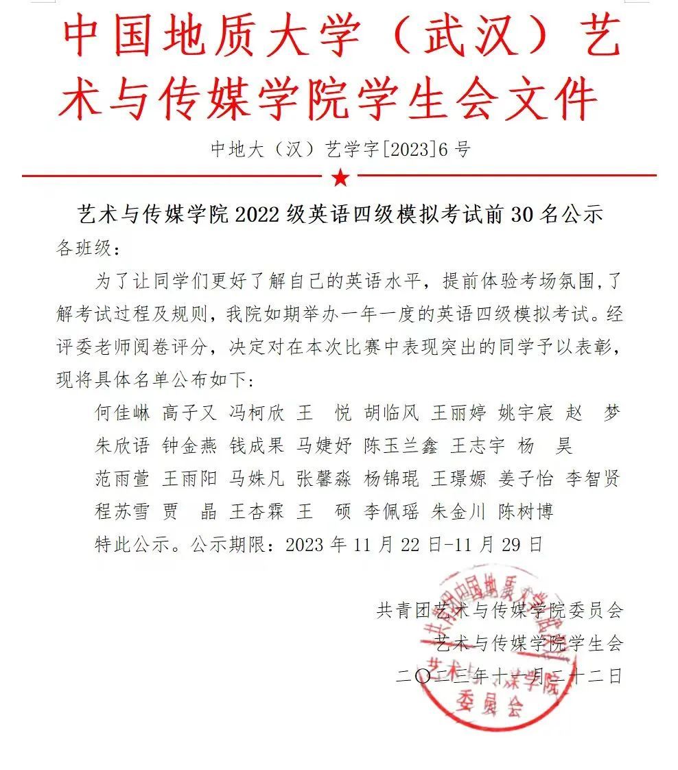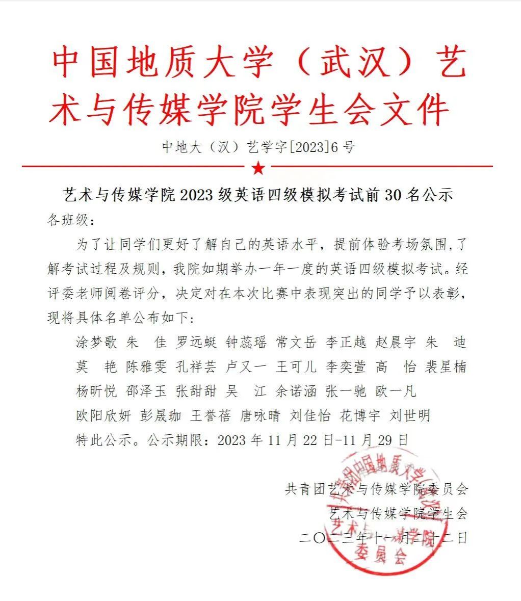 公示 | 亚洲第一黄色网站英语四级模拟考试前三十名公示