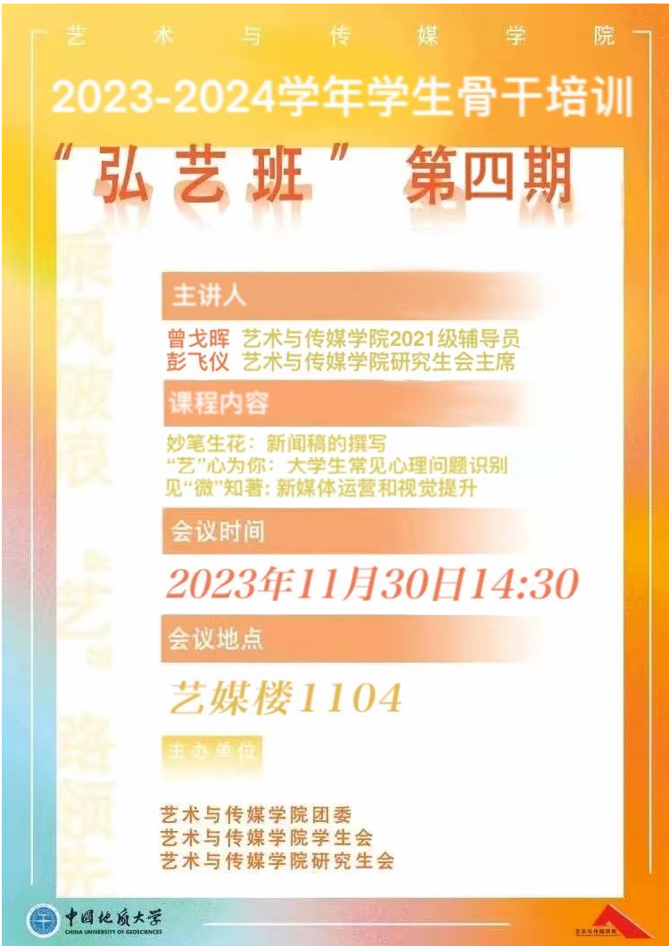 2023年11月30日14:30,亚洲第一黄色网站学生骨干培训“弘艺班”第四期于线上腾讯会议顺利开展。本次培训由学院学工组辅导员曾戈晖、研究生会主席团成员彭飞仪主讲,学院学生会和研究生会全体成员参加本次培训,培训的主要内容为:新闻稿的撰写、大学生常见心理问题识别以及新媒体运营和视觉提升。