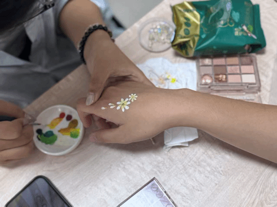 活动现场洋溢着浓厚的艺术气息与节日的欢快气氛。同学们充分发挥想象力,以面部、手部为画布,用缤纷的油彩描绘出对祖国的深情祝福与对传统佳节的美好期许。灵动可爱的玉兔、象征团圆的明月、鲜艳的五星红旗、绽放的绚烂礼花……一个个充满巧思的图案跃然于面颊之上,不仅是对绘画技艺的体验,更是一次情感的释放与表达。活动在轻松愉快的氛围中进行,欢声笑语不断,构成了一幅温馨动人的校园画卷。