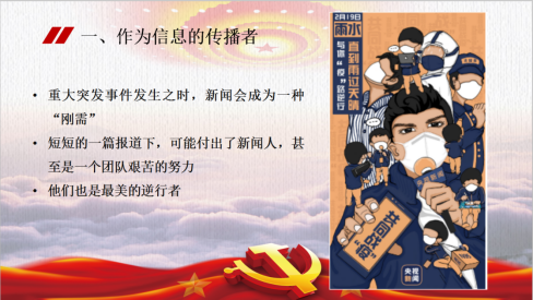雷雪晴:为了响应学校微党课大赛的号召,我们支部特意准备了以“讲好战疫故事,诠释初心使命——致敬抗疫一线新闻工作者”为主题的微党课。我们的党课主要分为四个部分:一是报道抗“疫”故事的“逆行者”;二是战“疫”故事的讲述人,初心使命的诠释者;三是新闻人的初心与使命——把理想和信念根植于新闻实践;四是新闻传播学专业党员的初心与使命。主讲人分别为:刘沫、我、黄天佑、任红星。下面我们将依次为大家讲解。