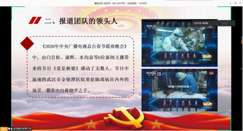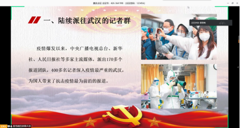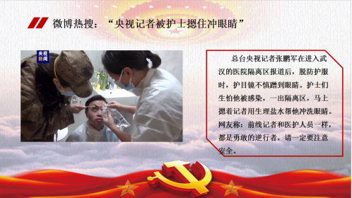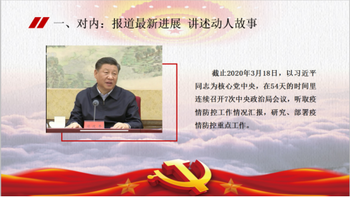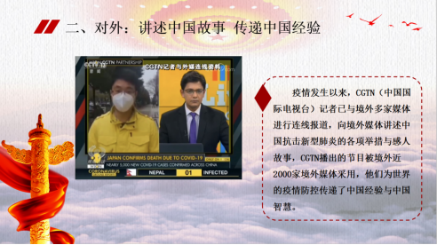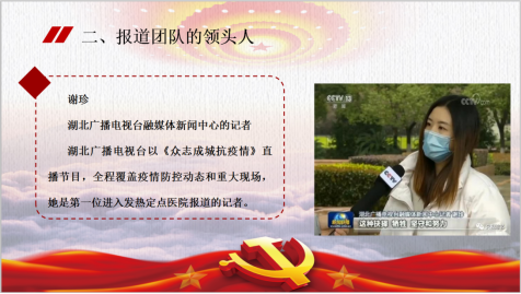 雷雪晴:在这开始我想问大家一个问题:当我们在聆听战“疫”故事时,我们大多数人都可能会首先关注故事的人物、故事的内容、故事的主题,但是我们是否曾经关注过讲述故事的人呢?正是有了新闻记者这样一批人,我们才能看到、听到一个又一个抗击新冠肺炎的感人故事。新闻人是战疫故事的讲述人,更是初心使命的诠释者。下面,我将从对内与对外两个方面来讲述。