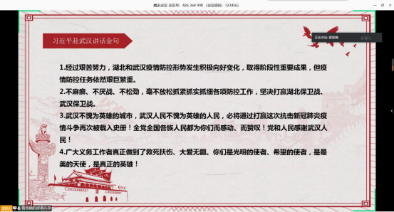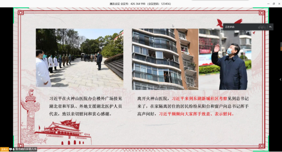 会议第一项:支部书记雷雪晴带领与会党员学习习近平总书记在湖北省考察新冠肺炎疫情防控工作讲话精神。