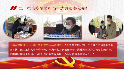 在抗击新冠肺炎疫情的战场上,涌现了一批志愿者群体,他们同许多医务工作者一样主动请缨,遍布在疫情最需要的地方,支部积极分子杨丛逊便是其中一员。2018级新闻传播学研究生的杨丛逊来自湖北省恩施土家族苗族自治州鹤峰县,新冠肺炎疫情在家乡爆发后,杨丛逊第一时间积极主动报名成为了一名青年志愿者,站在了家乡抗疫第一线。他说:“疫情期间,社区工作人员十分辛苦,作为一名入党积极分子,应时刻牢记为人民服务的宗旨,在困难时期勇于担当,贡献出自己的青春力量。”