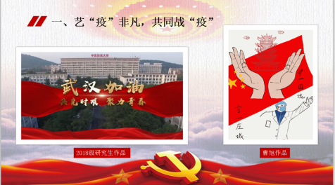 2018级新闻传播学研究生团支部制作了《聚力青春,共克时艰》的微视频,新闻传播学研究生党支部部分党员同志和入党积极分子共同拍摄了《武汉加油,中国加油!》微视频为武汉和中国加油,此外支部党员曹旭、王雪纯、李昀、雷雪晴、黄天佑、李雪、刘沫等用海报、图片、征文等形式诉说着抗疫的故事。
